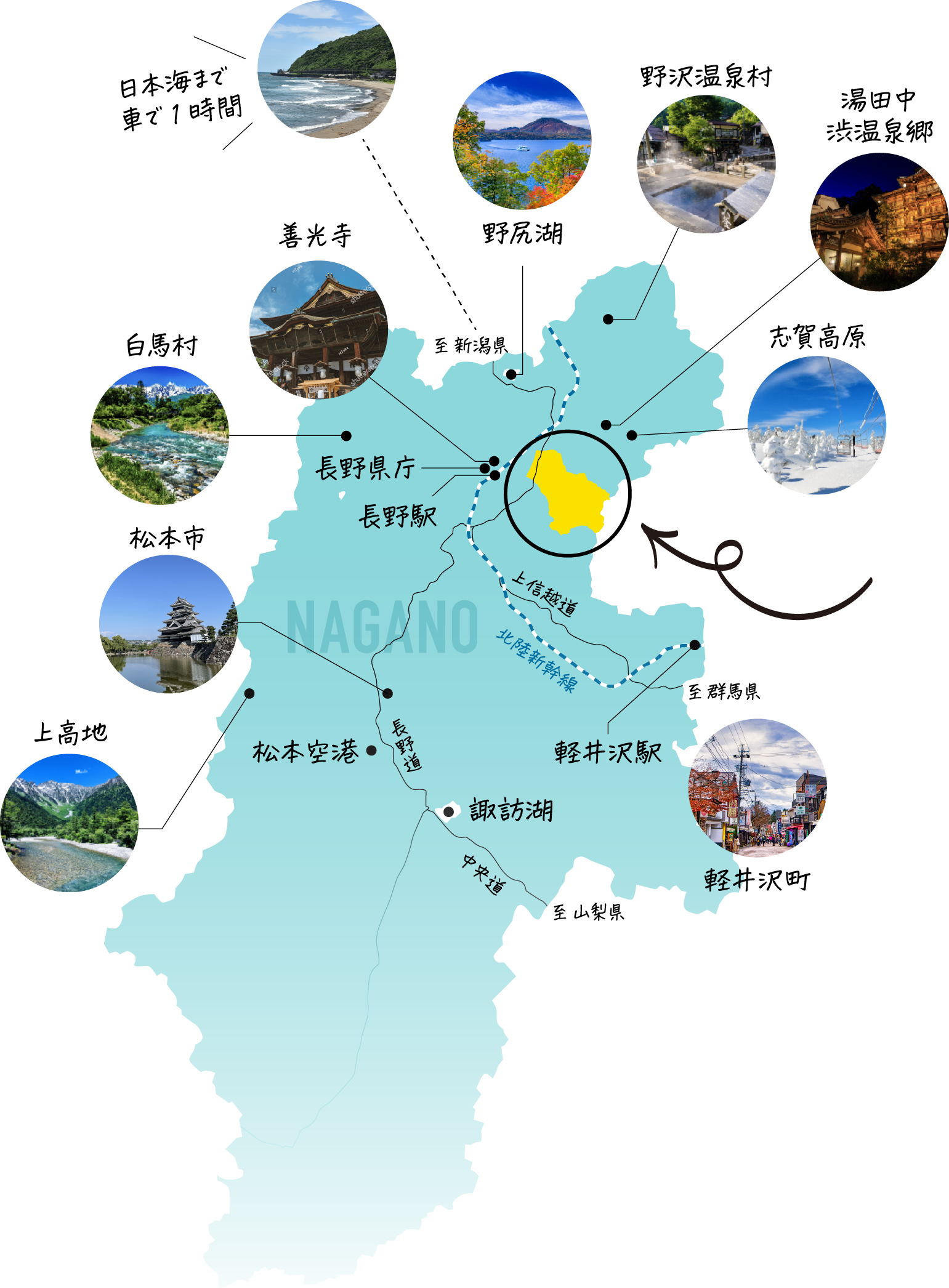 北陸新幹線の長野駅や長野県庁までは、車で約30分。
